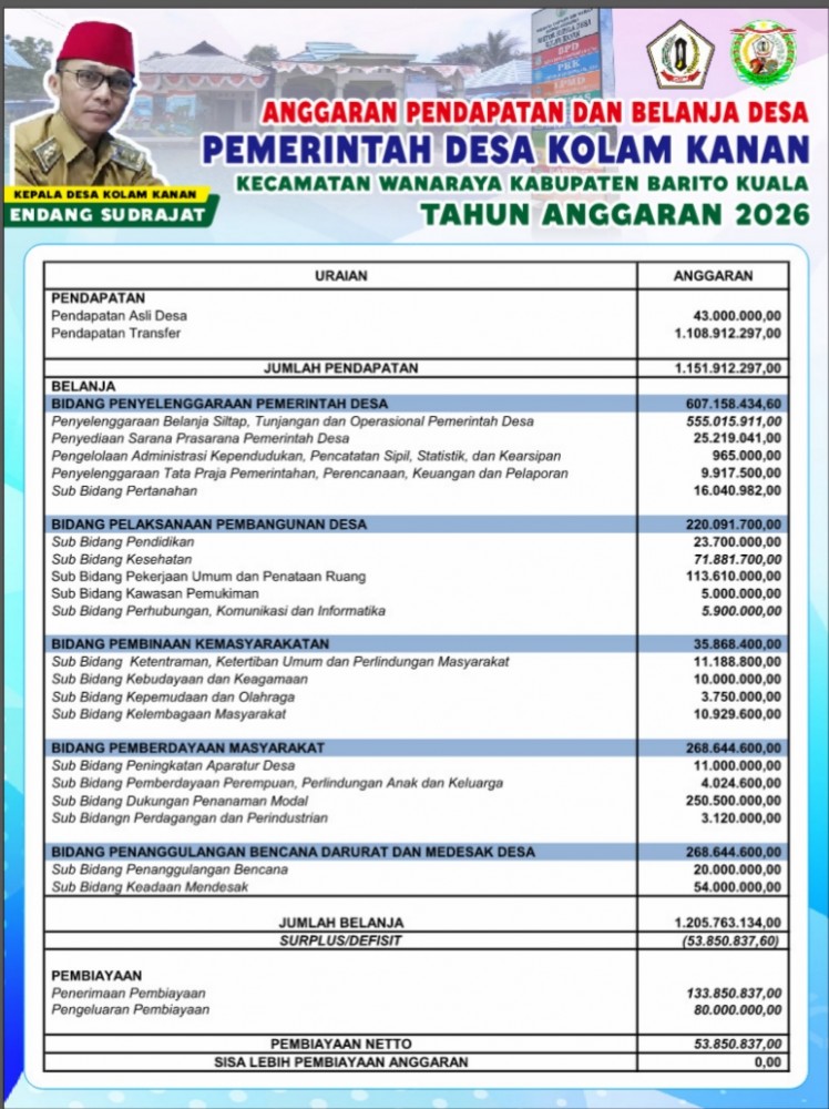 Pemerintah Desa Kolam Kanan Kecamatan Wanaraya berkomitmen mewujudkan tata kelola keuangan desa yang transparan dan akuntabel. Infografis APBDesa TA 2026 ini di pasang sebagai bentuk keterbukaan informasi publik, agar masyarakat mengetahui rencana pendapatan dan rincian belanja desa untuk pembangunan tahun anggaran 2026.
